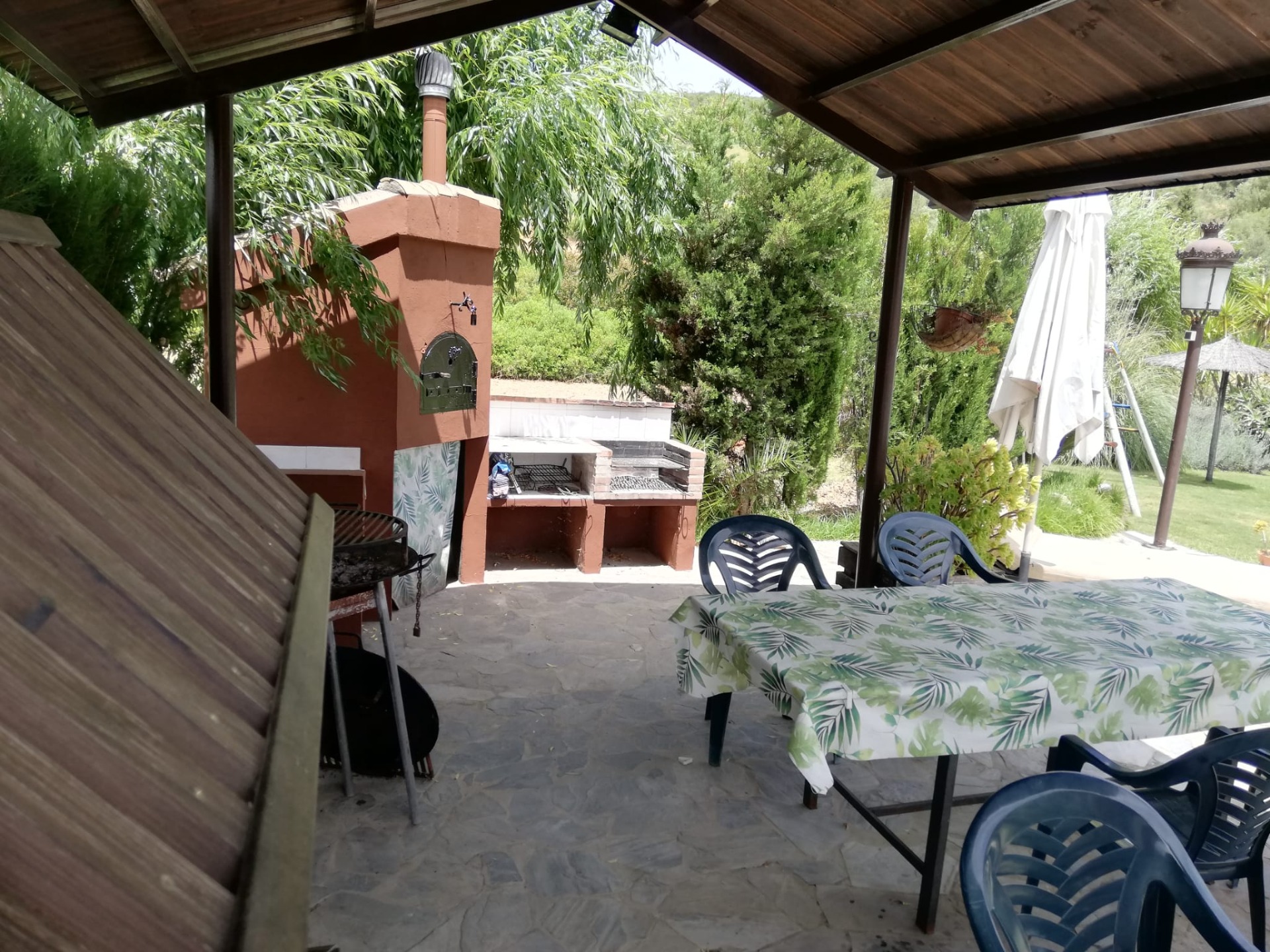 En el exterior podrás disfrutar de una zona de barbacoa con pérgola, horno de barro, baño, cocina, jardín, columpio y zona de aparcamiento.