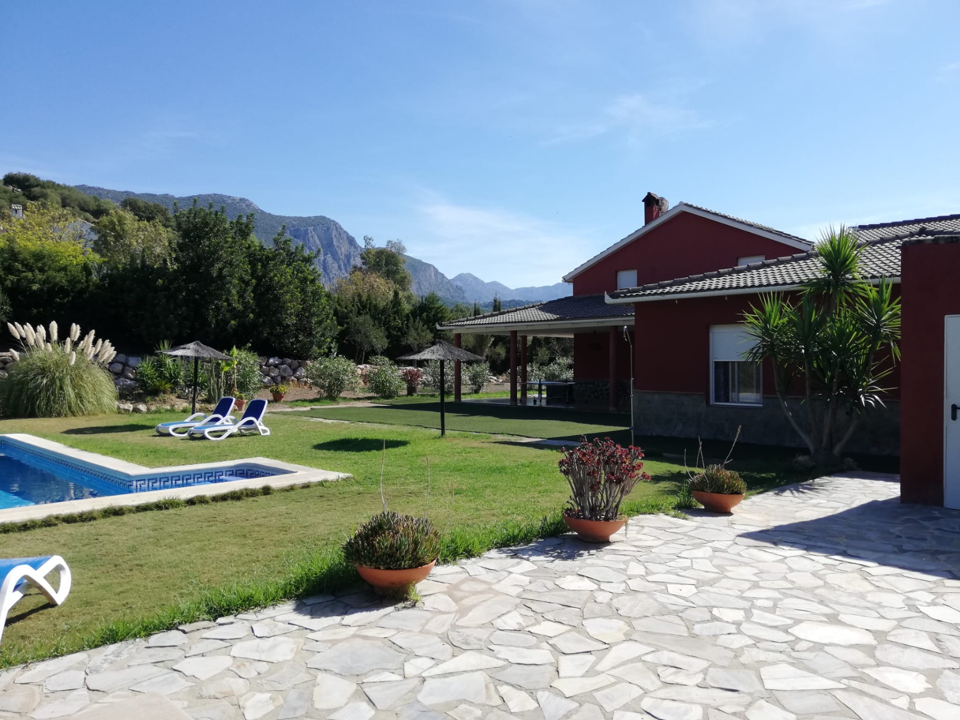 La casa dispone de 5 habitaciones amplias, dos baños completos y dos aseos, dos porches, piscina y cocina totalmente equipada, ofreciendo una estancia cómoda tanto para familias como para grupos.